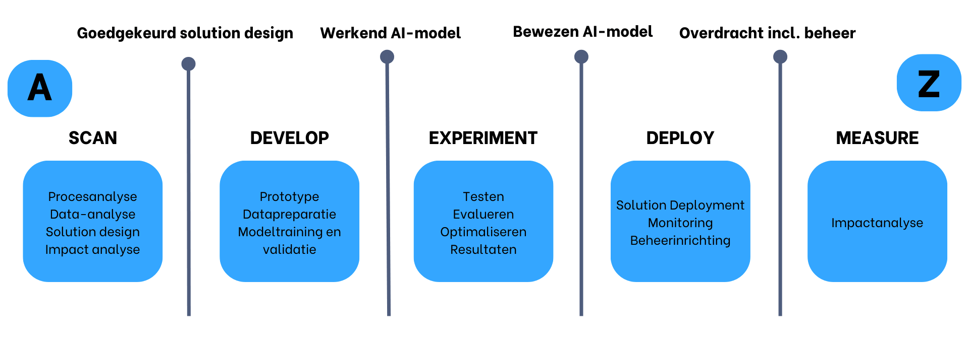 Als er – vanuit onze AI-roadmap of vanuit eigen initiatief – een beeld is van welke AI-implementatie de gewenste impact heeft op jouw organisatie, gaan we aan de slag. Immers, we beschouwen succesvolle implementaties als ons bestaansrecht.